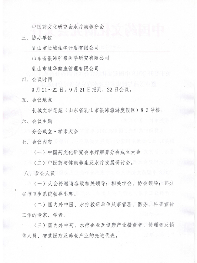 本次会议由中国药文化研究会主办,中国药文化研究会水疗康养分会承办,乳山市长城住宅开发有限公司和山东省银滩矿泉医学研究有限公司协办。