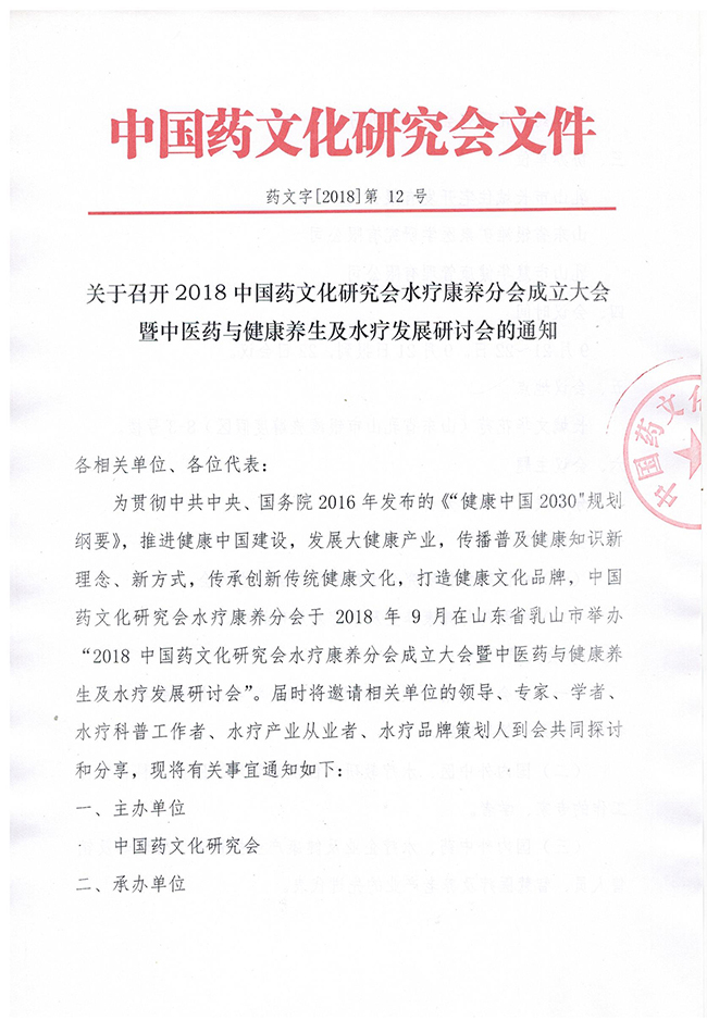 为贯彻中共中央、国务院20 1 6年发布的《“健康中国2030"规划纲要》,推进健康中国建设,发展大健康产业,传播普及健康知识新理念、新方式,传承创新传统健康文化,打造健康文化品牌,中国药文化研究会水疗康养分会于201 8年9月在山东省乳山市举办“201 8中国药文化研究会水疗康养分会成立大会暨中医药与健康养生及水疗发展研讨会”。届时将邀请相关单位的领导、专家、学者、水疗科普工作者、水疗产业从业者、水疗品牌策划人到会共同探讨和分享。